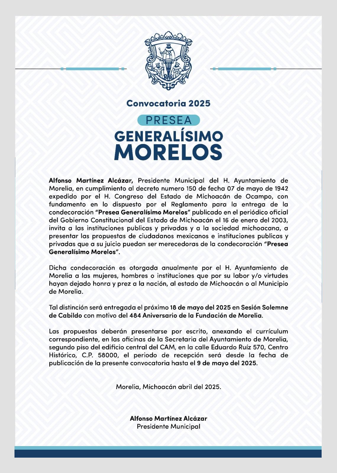 Esta convocatoria forma parte del esfuerzo anual del Ayuntamiento de Morelia, presidido por Alfonso Martínez Alcázar, para reconocer a ciudadanas, ciudadanos e instituciones cuya labor, aportaciones y virtudes, han contribuido de manera significativa al bienestar y desarrollo de nuestra ciudad, estado y nación.