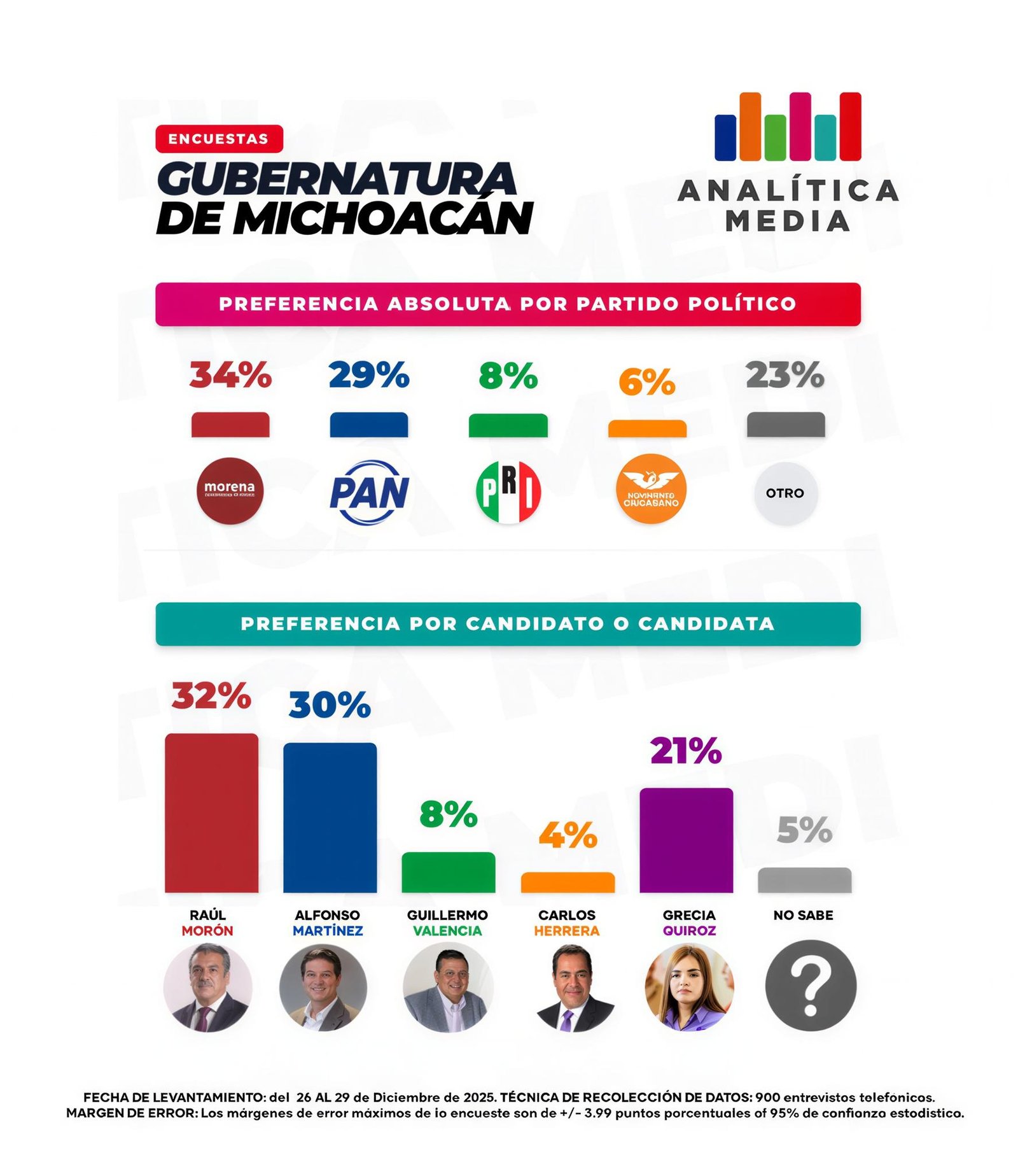 De acuerdo al último estudio de Analítica Media, Alfonso Martínez, alcalde de Morelia, comparte técnicamente el primer puesto con el candidato de Morena, seguido de la candidata independiente y más rezagado, el abanderado del PRI.