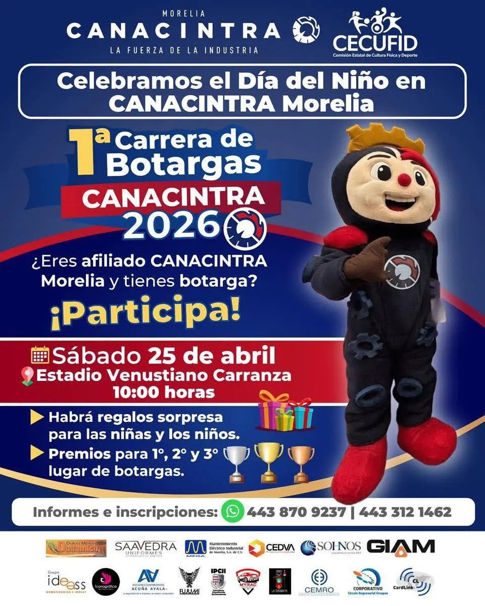 Morelia, Mich.- Con motivo del Día de la Niñez, la Cámara Nacional de la Industria de Transformación (CANACINTRA) delegación Morelia, anunció la realización de su primera carrera de botargas, la cual se llevará a cabo el próximo sábado 25 de abril. El evento contempla diversas actividades, módulos y sorpresas dirigidas a niñas, niños y sus familias.