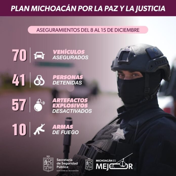 Morelia, Mich.- En un periodo de ocho días, en el estado se aseguraron 41 personas por presuntos actos ilícitos, 57 artefactos explosivos, 70 vehículos, 10 armas de fuego y casi mil cartuchos útiles, derivado de las acciones del Plan Paricutín en Michoacán.