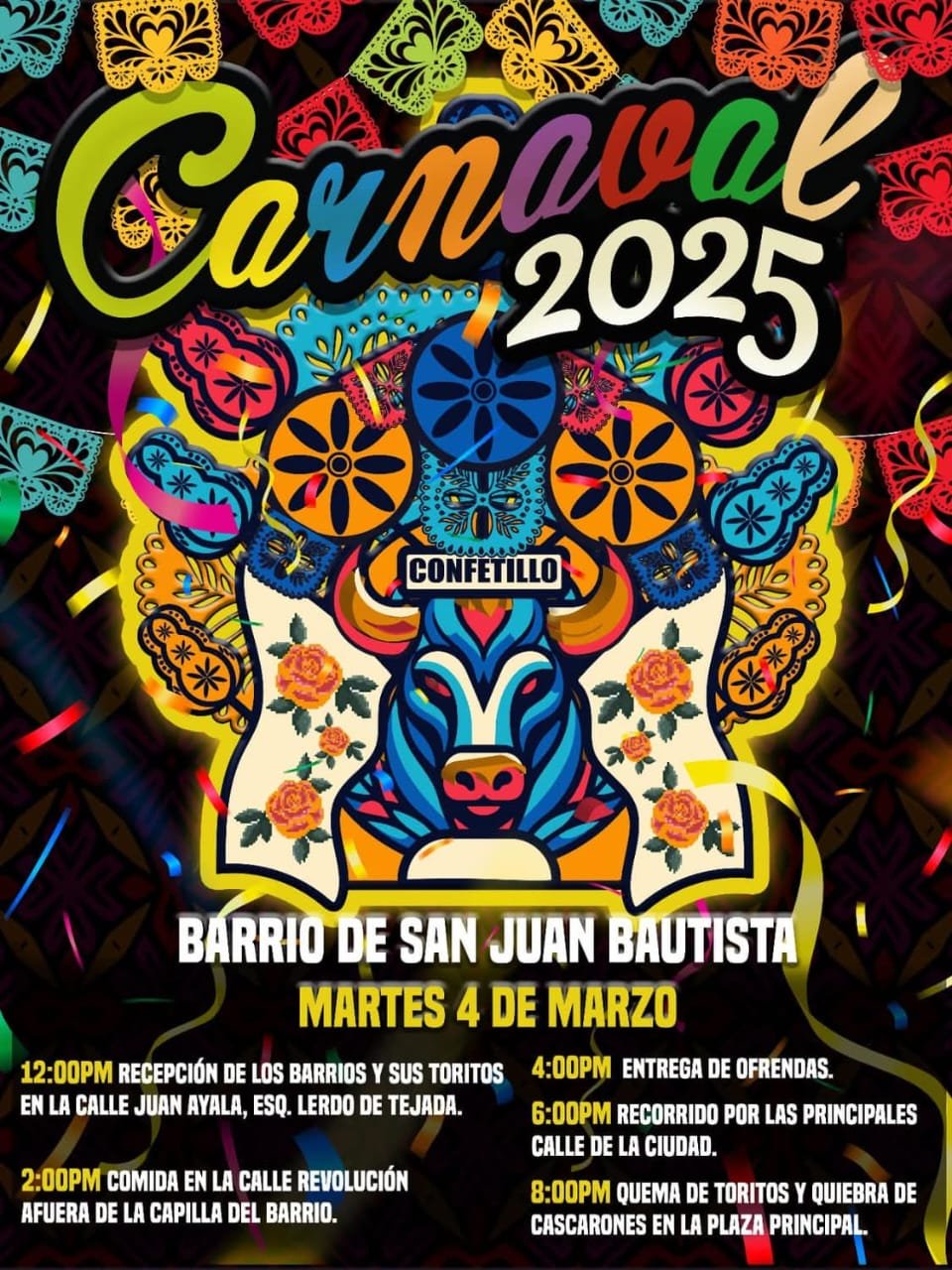 El programa contempla, para este 4 de marzo, la recepción de los demás barrios y sus toritos, a las 12 horas, en la esquina de las calles Juan Ayala y Lerdo de Tejada. Dos horas después, el barrio anfitrión ofrece una comida a sus invitados en la calle Revolución, frente a la Capilla a San Juan Bautista.