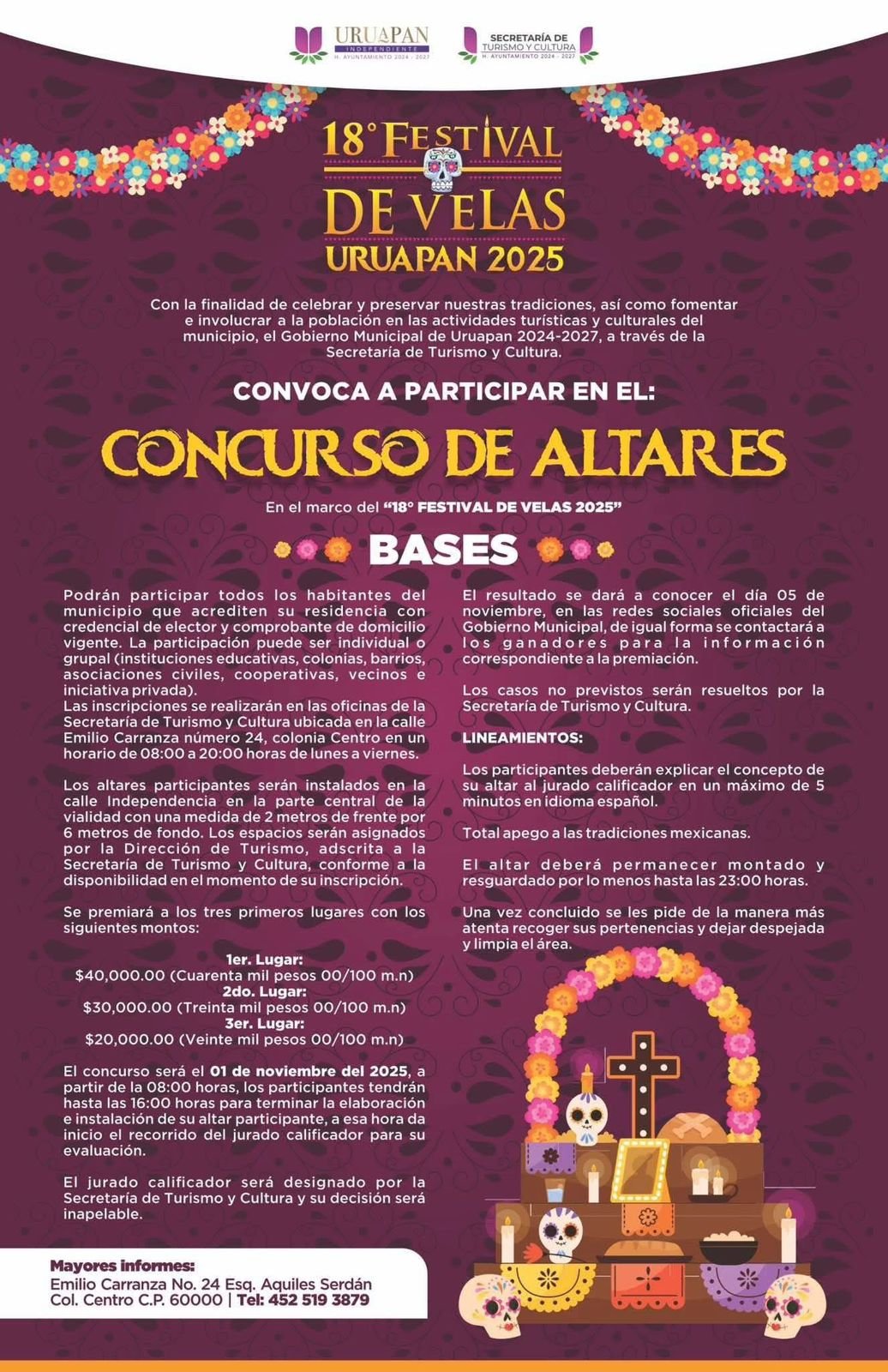 Uruapan, Mich- El gobierno municipal invita a la población a participar en el Concurso de Altares que se realizará durante el 18° Festival de Velas 2025 de Uruapan; el próximo 1 de noviembre.
