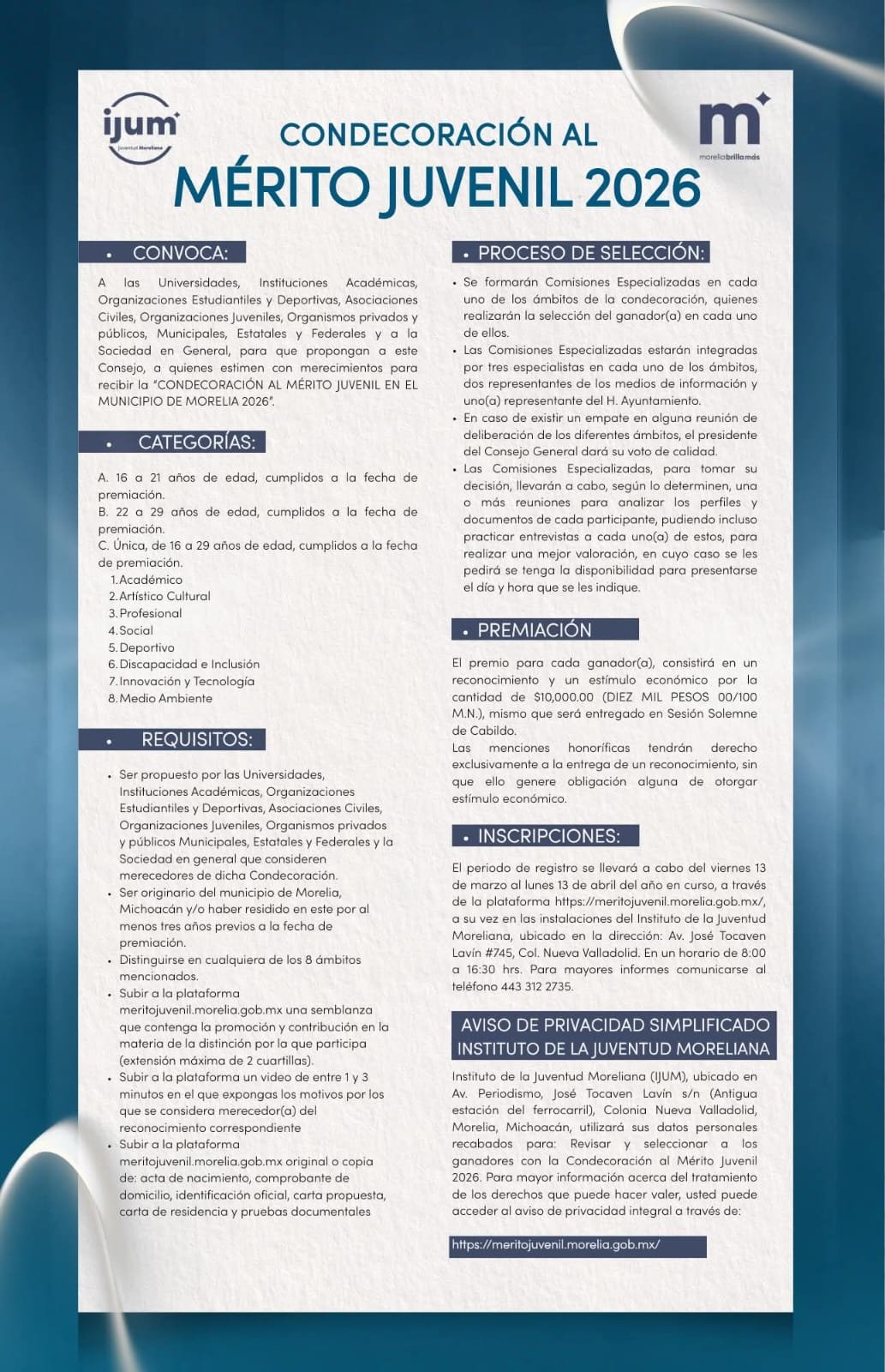 Las y los interesados pueden conocer la convocatoria completa disponible en el siguiente enlace: https://meritojuvenil.morelia.gob.mx/