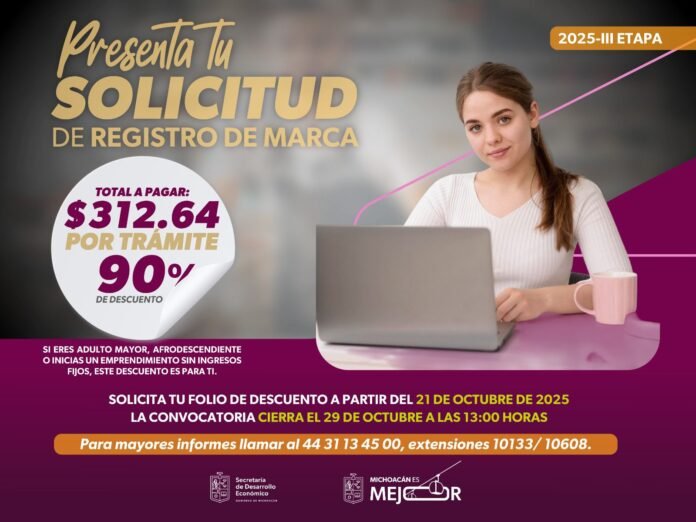 Morelia, Mich.- La Secretaría de Desarrollo Económico (Sedeco), a cargo de Claudio Méndez Fernández, invita a la ciudadanía a participar en la Campaña de Precio Diferencial de Tarifas/ Buen Fin: Marcas para el Bienestar, que brinda una reducción del 90 por ciento en el costo del trámite de registro de marca, aviso comercial o nombre comercial ante el Instituto Mexicano de la Propiedad Industrial (IMPI), informó la dependencia estatal.