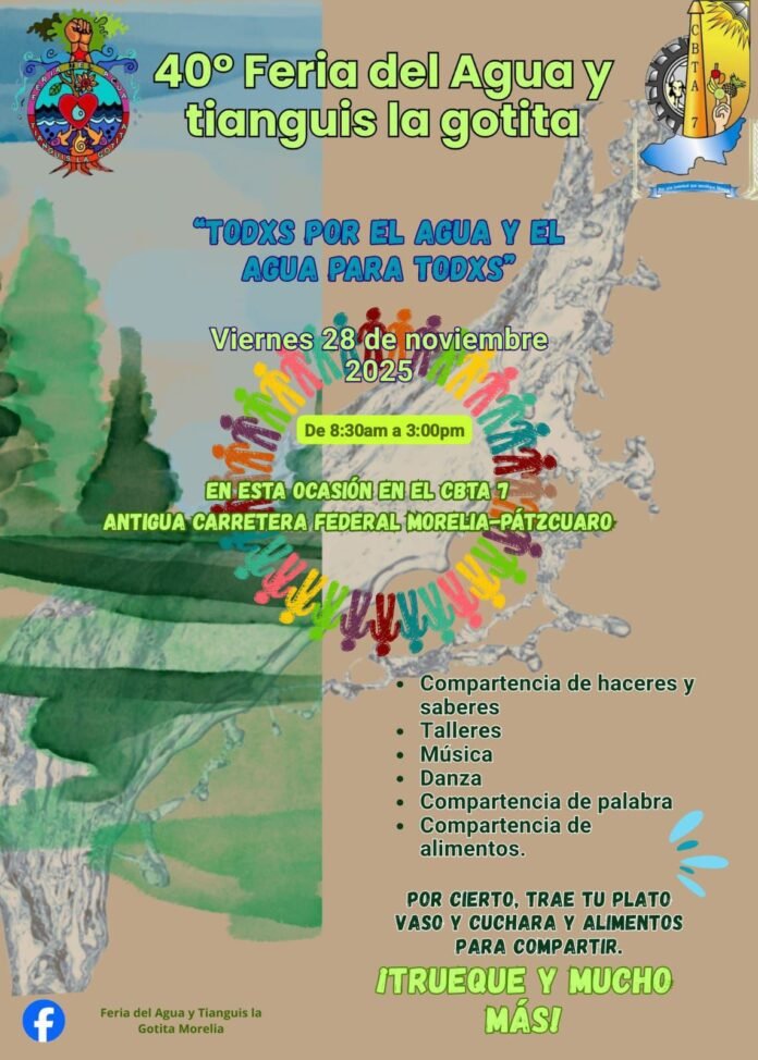 Morelia, Mich. — La Feria del agua y tianguis “la Gotita” y El Centro de Bachillerato Tecnológico Agropecuario No. 7 (CBTA 7) invitan a la ciudadanía en general a participar en la 40ª edición de la Feria del Agua y el Tianguis “La Gotita”, evento que se llevará a cabo el próximo viernes 28 de noviembre de 2025, a partir de las 9:00 horas, en las instalaciones del plantel, ubicado en la antigua carretera Morelia–Pátzcuaro.