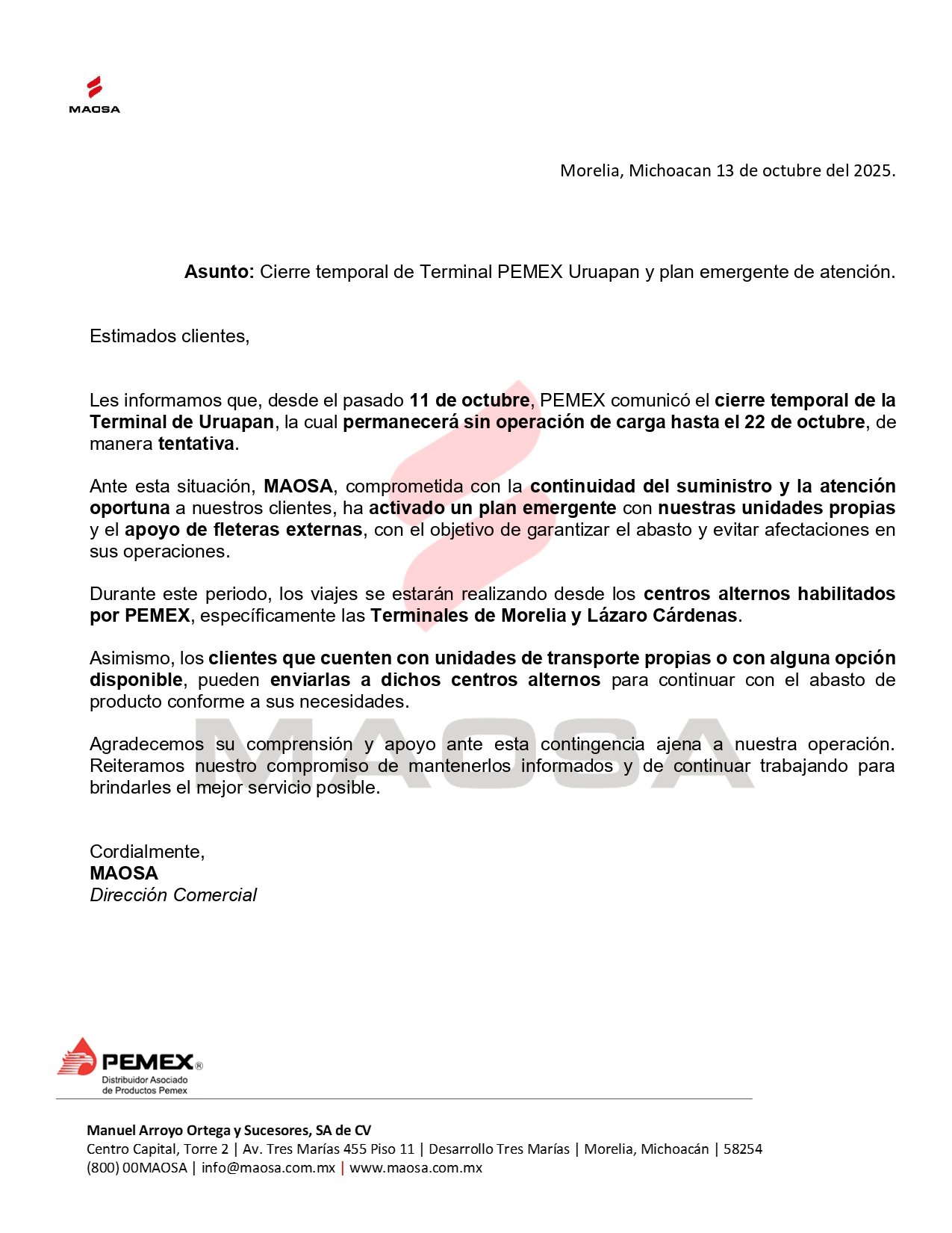 Lo anterior de acuerdo a un documento que circula en redes sociales, en el cual la empresa Moesa, una de las que surte a la planta Pemex de Uruapan, señala estar en conocimiento de que la escasez de gasolinas en esta región inició el 11 de octubre y se estima que concluirá el 24 de octubre, y afecta únicamente a las estaciones de servicio que se surten con PEMEX.