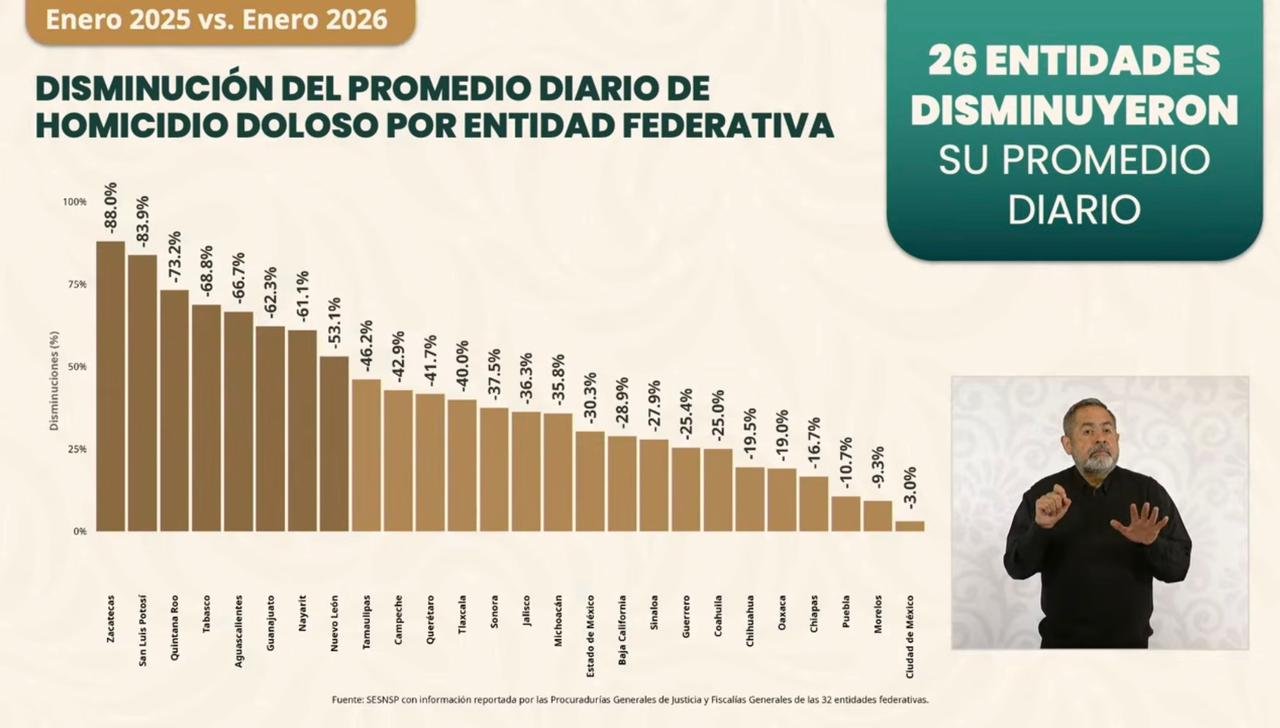 Durante la Conferencia del Pueblo, se realizó una comparación de enero de 2025 con el mismo mes de este año, la entidad se colocó entre los 26 estados del país que redujeron su promedio diario.