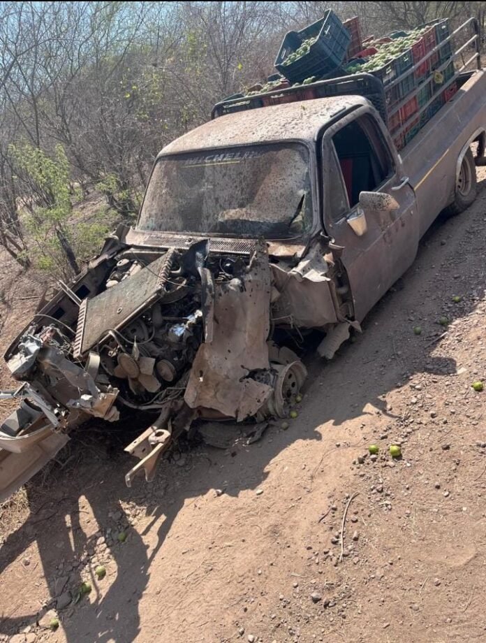 Apatzingán, Mich.-Una camioneta fue destruida al detonar un artefacto explosivo improvisado tipo mina terrestre en la localidad de Puerta de Alambre, dejando como saldo un hombre herido leve.