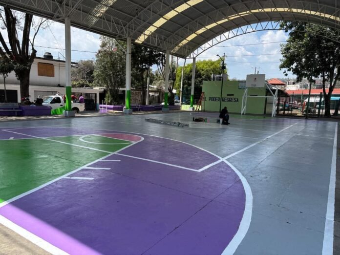 Entre los trabajos realizados destacan la pintura y balizamiento de la cancha de usos múltiples, la reparación de tableros y colocación de redes en los aros, así como la rehabilitación y pintura del área de juegos infantiles.