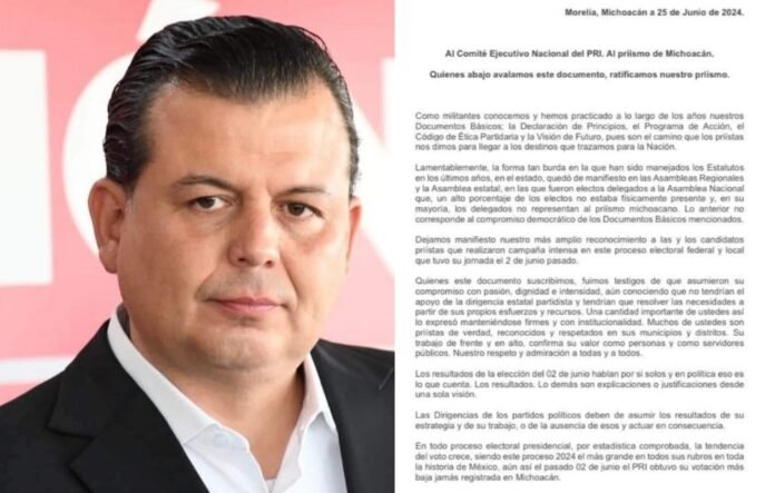 A través de una misiva, integrada por 29 cuartillas y muchísimas firmas, enviada al Comité Ejecutivo Nacional, los priistas expresaron su molestia por el trabajo del oriundo de Tepalcatepec, al lograr “la peor cosecha de votos en las pasadas elecciones”.
