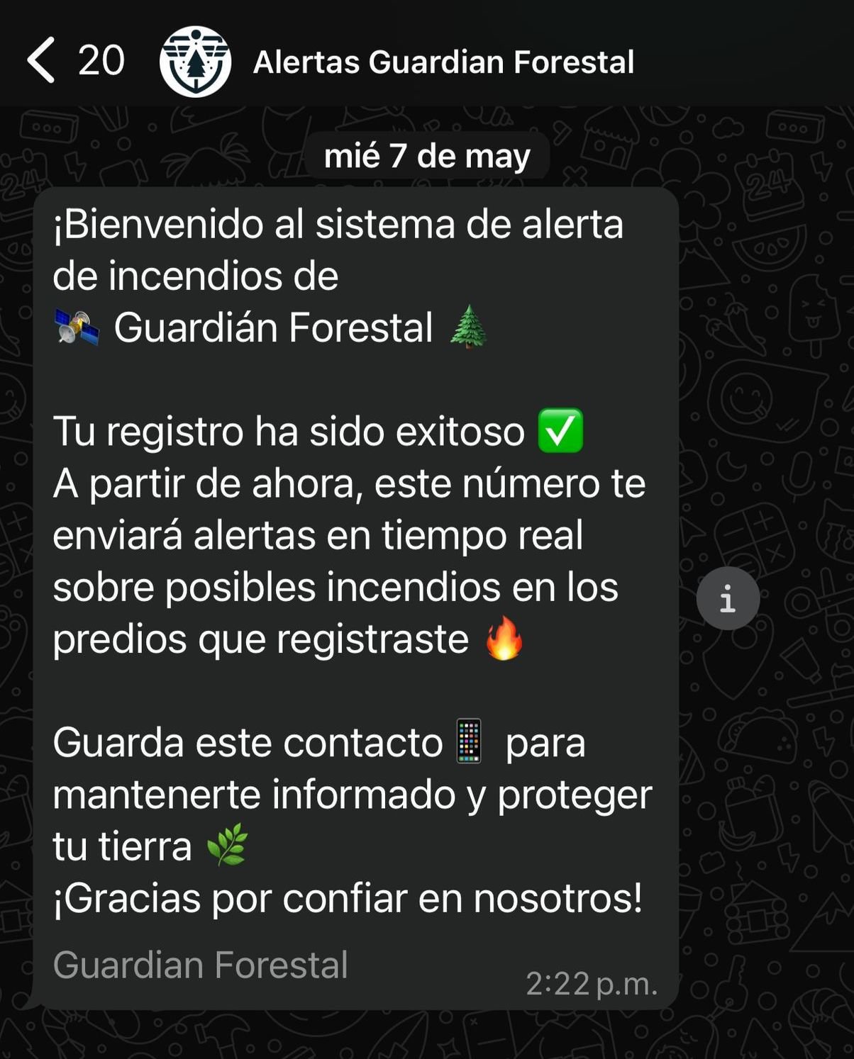 Para registrarte solo es necesario entrar al sitio web www.guardianforestal.com e ingresar nombre, correo electrónico y número telefónico para crear una cuenta. Se deberá trazar en el mapa el polígono de la propiedad o zona de interés para darlas de alta, activar la alarma y listo. Recibirás un mensaje de confirmación vía WhatsApp, minutos después de tu registro.