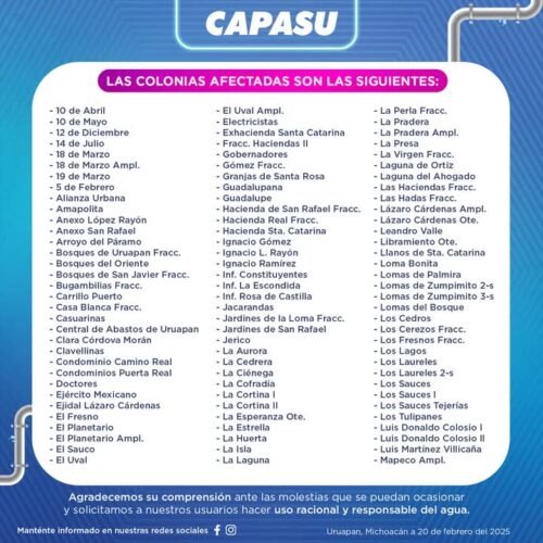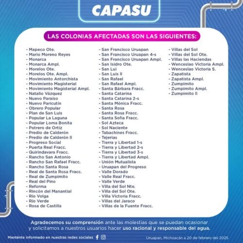 La Comisión de Agua Potable y Alcantarillado de Uruapan (CAPASU) informó esta mañana que personal técnico ya trabaja en la reparación del tramo averiado.