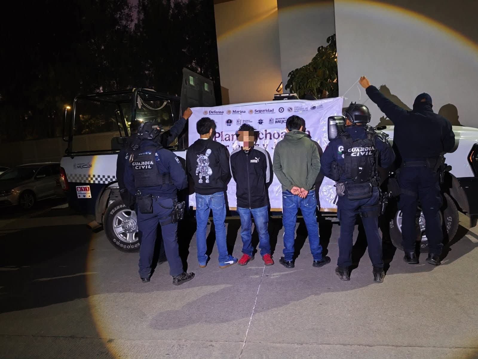 Elementos de la Guardia Civil, Policía Municipal, Guardia Nacional, Ejército y la SSPC, lograron la detención de tres sujetos presuntamente relacionados con actividades de narcomenudeo y ataques con arma de fuego en esta cabecera municipal.