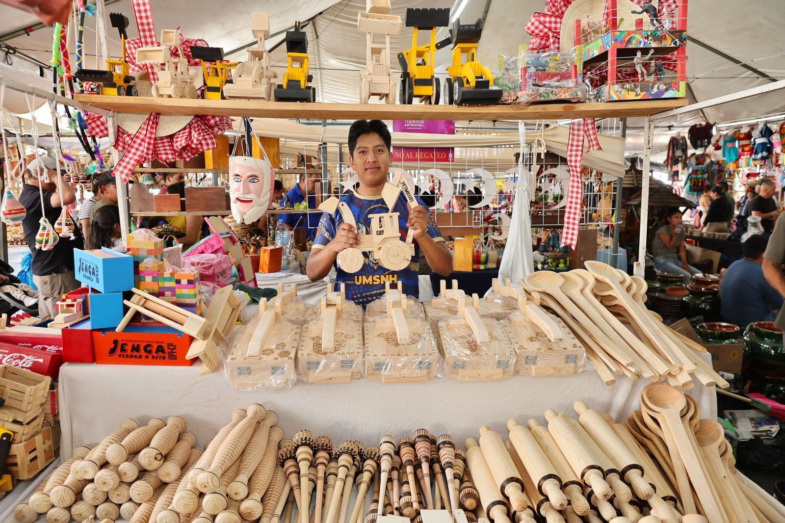 Mil 500 personas artesanas continúan en el centro de Uruapan en las principales plazas, con la venta de sus productos en las ramas de textiles, instrumentos de cuerda, alfarería, cobre, madera, fibras vegetales, maque, laca perfilada, máscaras, lapidaria, joyería, juguetería, entre otras que pueden adquirir.