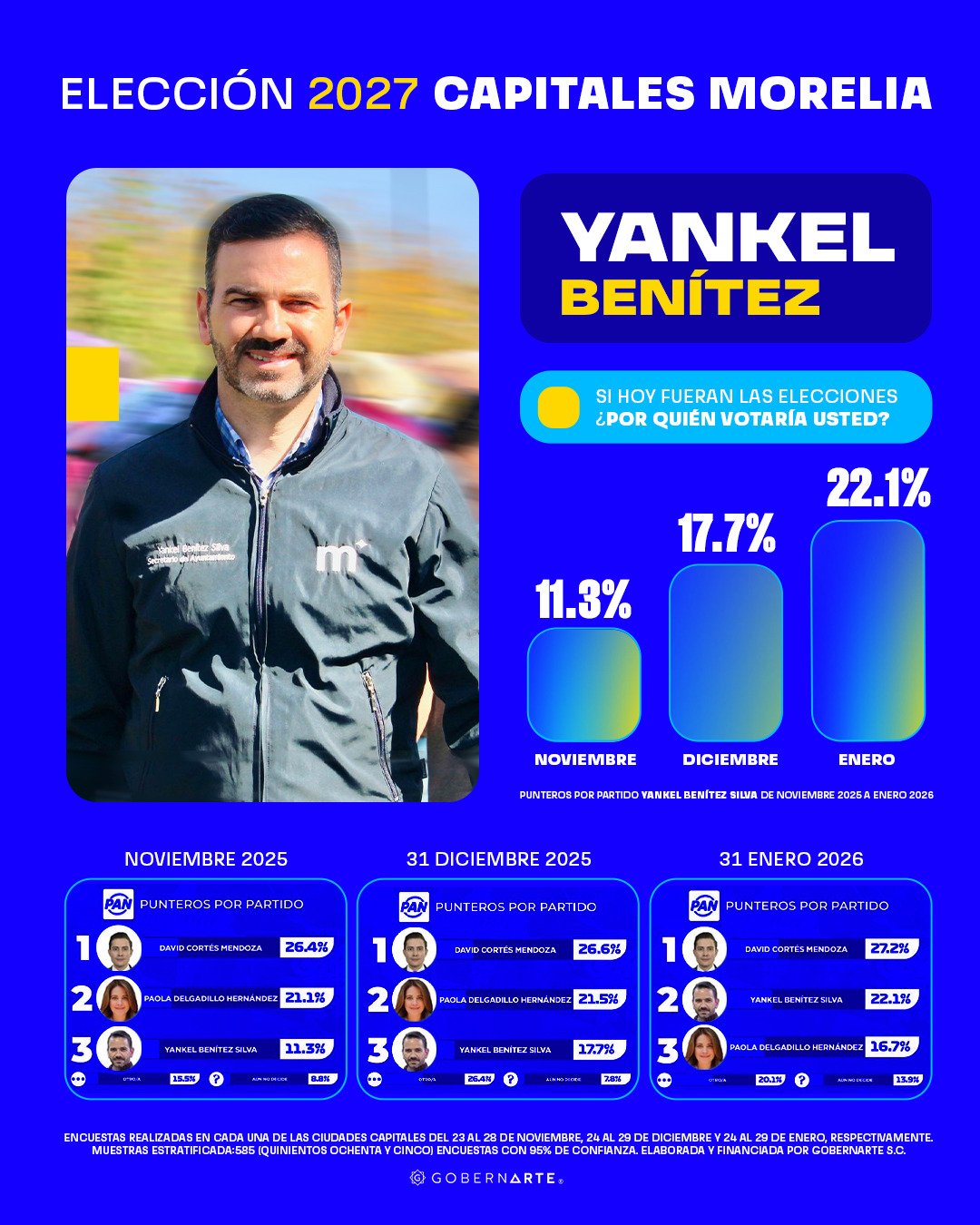 MORELIA, MICH.- La carrera por la candidatura del Partido Acción Nacional (PAN) para la Alcaldía de Morelia, coloca a Yankel Benítez Silva como el aspirante con mayor crecimiento y quien se proyecta para ser quien aparecerá en las boletas del próximo año.