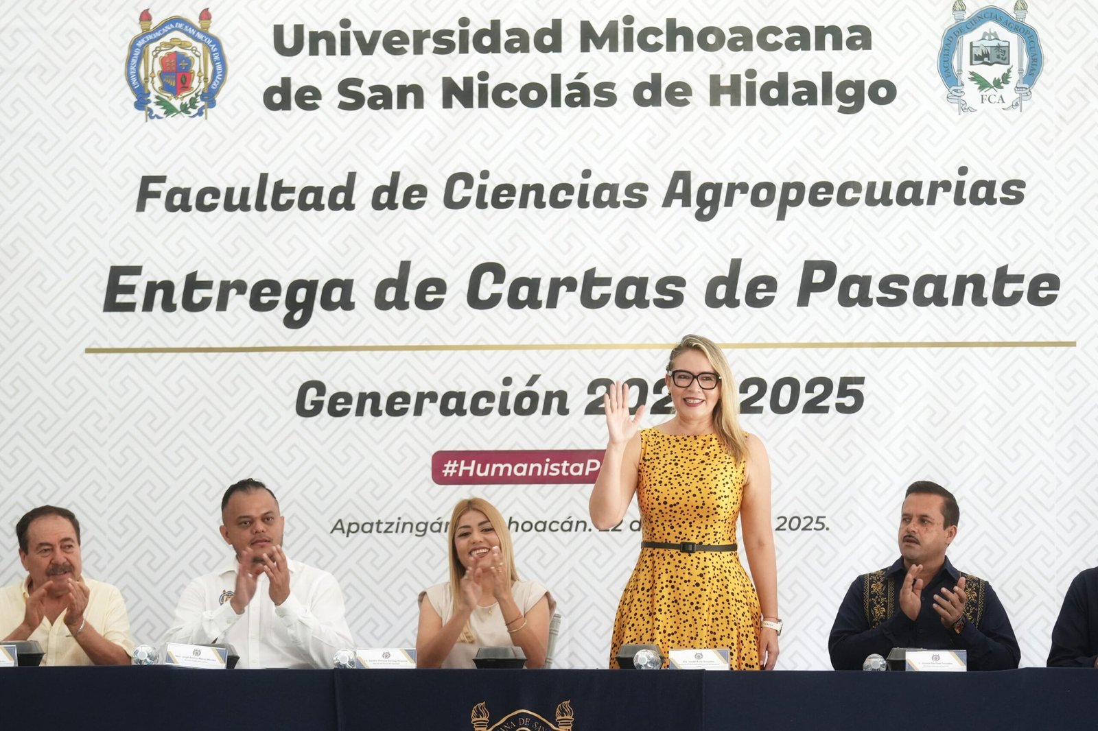 Apatzingán, Mich.- Con el compromiso de impulsar la Facultad de Ciencias Agropecuarias ubicada en el municipio de Apatzingán, la rectora de la Universidad Michoacana de San Nicolás de Hidalgo (UMSNH), Yarabí Ávila González, hizo entrega de cartas de pasante a egresadas y egresados de las Licenciaturas de Ingeniero Agrónomo Horticultor y de Administración de Empresas.